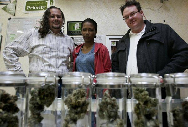 Mr. Valdez, left, Ms. Taylor and Mr. Thicke pose together at the medical marijuana dispensary. The UFCW believes the medical marijuana industry could support jobs across the country, from growers to truck drivers, carpenters and retail clerks.JONATHAN ALCORN/Reuters