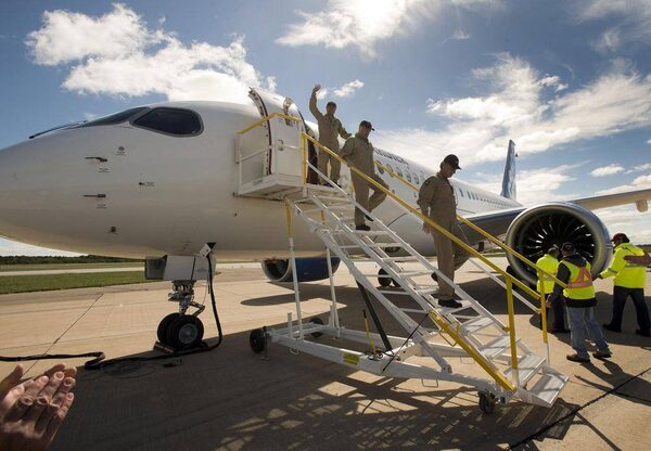 Test pilot Chuck Ellis, right, deplanes with his crew after Bombardier’s C-S100 maiden test flight at the company's facility Monday, September 16, 2013 in Mirabel, Que. THE CANADIAN PRESS/Ryan RemiorzRyan Remiorz/The Canadian Press
