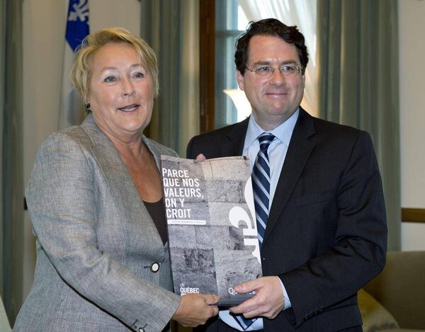 Quebec Premier Pauline Marois receives the Charter of Quebec Values from Citizenship Minister Bernard Drainville Sept. 10, 2013 at the legislature in Quebec City.Jacques Boissinot/The Canadian Press