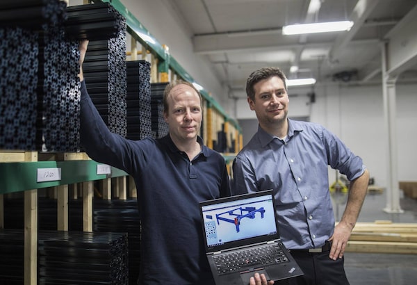 Max Windisch, left, and Etienne Lacroix, right, co-founders of Vention, a digital machine manufacturing platform, at their company offices in Montreal on Thursday, January 11, 2018.Dario Ayala/The Globe and Mail