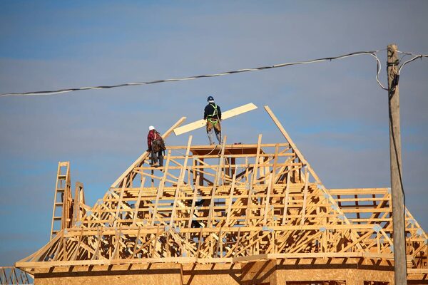 Two roofers standing on top of the roof frame of a new house in Vaughan, Ont.bukharova/Getty Images