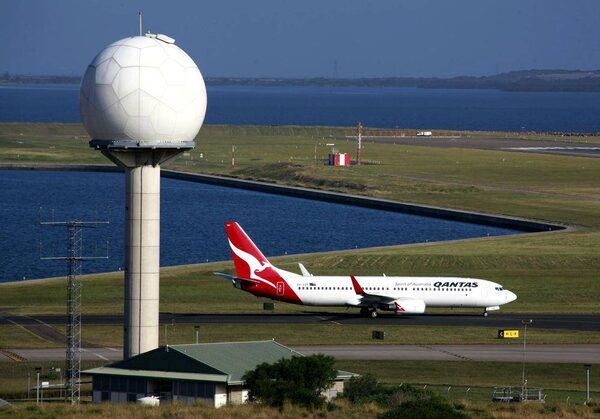A Qantas Airways plane passes a radar tower after landing at Sydney Airport April 29, 2013.DAVID GRAY/Reuters