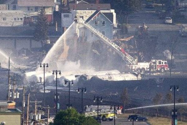 Fire fighters douse rail containers in downtown Lac-Mégantic, Que., early July 7, 2013.