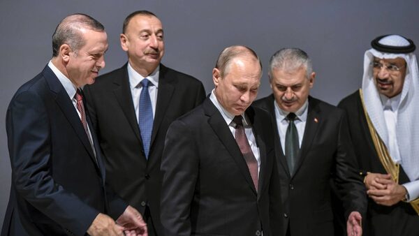 Turkey's President Recep Tayyip Erdogan, Azerbaijan's President Ilham Aliyev, Russia's President Vladimir Putin, and Turkey's Prime Minister Binali Yildirim attend the 23rd World Energy Congress on October 10, 2016 in Istanbul.OZAN KOSE/AFP / Getty Images