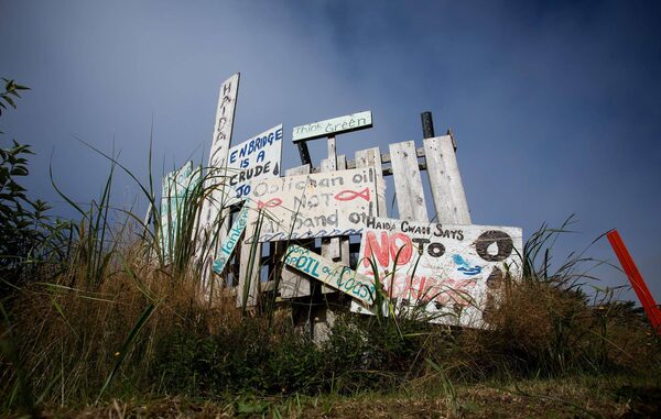 Handmade anti-pipeline signs are seen on the side of a road in the First Nations village of Old Massett, British Columbia, Canada, on Thursday, Aug. 25, 2016. Facing five major energy initiatives in B.C., Canadian Prime Minister Trudeau will choose which constituency to abandon. He's allowed a hydroelectric dam to proceed; pending are decisions on Enbridge Inc.'s Northern Gateway crude pipeline, Petroliam Nasional Bhd.'s LNG project on Lelu Island, a pipeline expansion by Kinder Morgan Inc., as well as a ban on crude oil tankers. Photographer: Ben Nelms/BloombergBen Nelms/Bloomberg