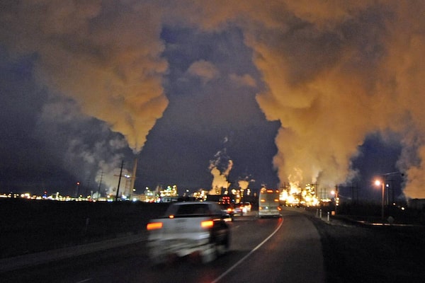 The Syncrude oil sands extraction facility, near Fort McMurray in Alberta, is seen at night on October 22, 2009.MARK RALSTON