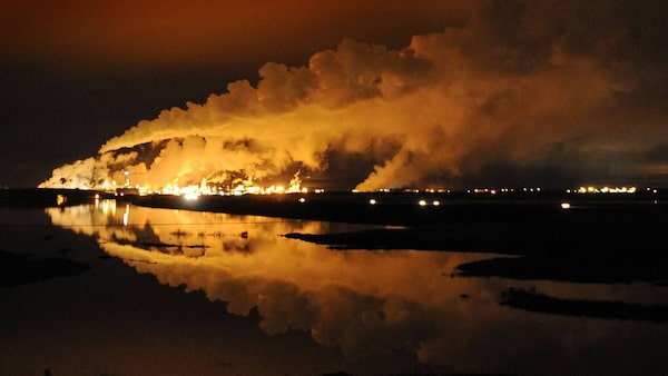 The Syncrude oil sands extraction facility is reflected in a lake reclaimed from an old mine near the town of Fort McMurray in AlbertaMARK RALSTON