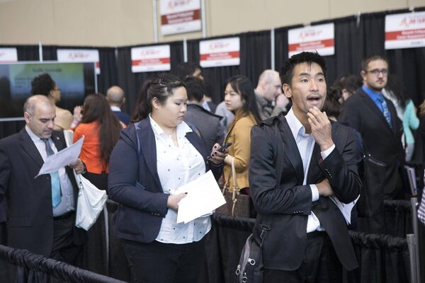 Job seekers wait in line for a resume review at a job fair in Toronto on Tuesday April 28 2015.Chris Young/The Globe and Mail