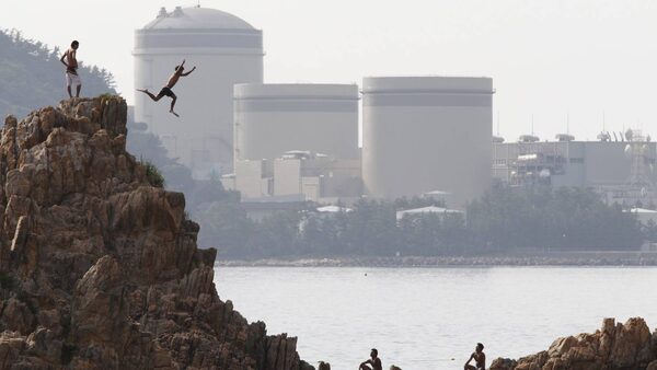 A man on vacation dives into the sea as Kansai Electric Power Co.'s Mihama nuclear power plant is seen in the background in Mihama town, Fukui prefecture, July 2, 2011.ISSEI KATO