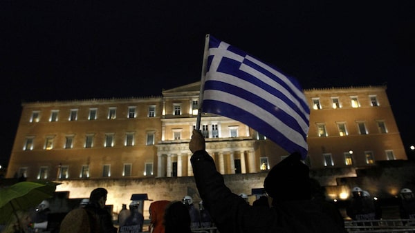 A protester holds up a Greek flag during an anti-austerity demonstration in front of the parliament in Athens Feb. 22, 2012.YANNIS BEHRAKIS
