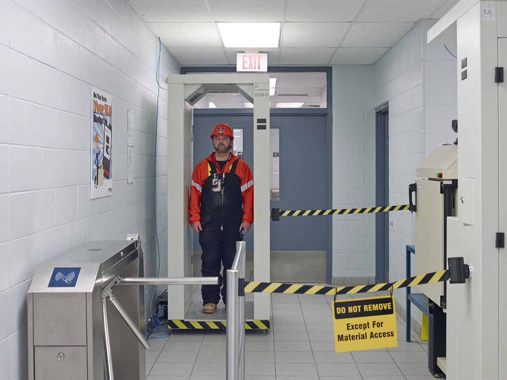 Apart from the three rural municipalities near McQuail’s farm, the towns in the running for the DGR are a kind of necklace of economically stressed communities strung across Northern Ontario’s broad Precambrian shoulders, with just one candidate further west in Saskatchewan. To get even an inkling of the scale of what would be involved in the transformation of one of these places should it be chosen for the DGR, one would do well to visit the Bruce Power complex, a bit north of Kincardine, Ontario. There, eight CANDUs boil away around the clock, kicking out 6,300 megawatts of power and occupying nearly half of the company’s 4,250 staff. It is a place that on a morning in midsummer presents as a vast and hazy torment, an impenetrable dreamscape that has somehow fetched up on the wide beaches of Lake Huron. The place is, among other things, miles of chain-link crowned with razor wire; towering brick reactor buildings without windows; and a cat’s cradle of power lines that, viewed from below, reinvent the sky as a crazy-quilt of triangles and parallelograms and scimitars. It is security personnel with side arms, flak jackets and glowering faces.