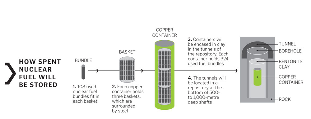 According to the plan, Canada’s 2.4 million spent fuel bundles, each the size of a fire log, will be placed in close-fitting steel containers, which in turn will be encased in containers of copper, reputed to be impervious to corrosion; then into a kind of igloo of Bentonite clay, which swells when wet, sealing off the entire package from corrosive elements.