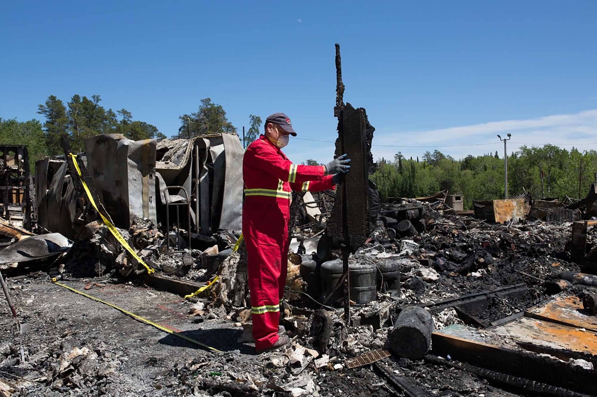 For the rest of the day, Smoke watches keenly from the sidelines while Swan works his way further into the twisted wreckage, taking photographs, making notes, bagging potential evidence. Fire captains, insurance reps and investigators from other companies drop by, ducking under the yellow tape and greeting Swan by name. He interviews the construction workers, focusing on the status of the project, their protocols for storing chemicals and tools, and whether any of them smoke cigarettes. He determines that the building was not yet wired, and checks with Environment Canada to see if there was lightning in the area on the night of the fire. The basement of the building is too dangerous to enter, so he rents a cherry-picker crane and dangles in the bucket high above the wreckage, photographing the collapsed walls and water-filled excavation.