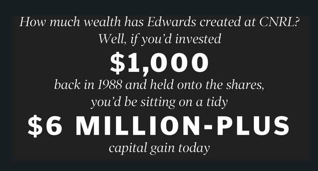 Penn West and Ensign have both had their moments, but it's Canadian Natural Resources Ltd. where Edwards made his reputation—and one hell of a lot of money. When it was recapitalized by Edwards and his team, CNRL had four employees, 100 barrels of production a day and a market capitalization of just under $1 million. It traded at 10 cents a share. Today, it vies with Suncor to be the biggest independent producer in Canada, and even in the face of one of the most vicious bear markets for energy stocks in a generation, its shares traded comfortably above $40 as of the end of October. How much wealth has Edwards created in the process? Well, if you'd invested $1,000 in CNRL shares back in 1988 and held onto them, you'd be sitting on a tidy $6 million-plus capital gain today.
