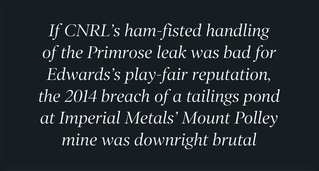 If the fallout from CNRL's ham-fisted handling of Primrose was bad for Murray Edwards's play-fair reputation, the consequences of the 2014 breach of a tailings pond at Imperial Metals' Mount Polley mine in British Columbia were downright brutal. The incident spilled 24 million cubic metres of toxic stew, some of which flowed into nearby rivers and lakes. As the biggest shareholder of Imperial, Edwards faced public and government anger for his company's pushing the envelope. As Bill Bennett, B.C.'s Minister of Energy and Mines, told the Financial Post, "[Imperial Metals was] in compliance, but they were—very often—very, very, very close to the line that if you cross it, you're getting into dangerous territory."