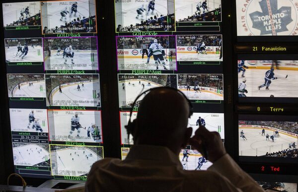 A producer looks over content in the broadcast truck for Hockey Night in Canada in December, 2014.Mark Blinch/The Globe and Mail