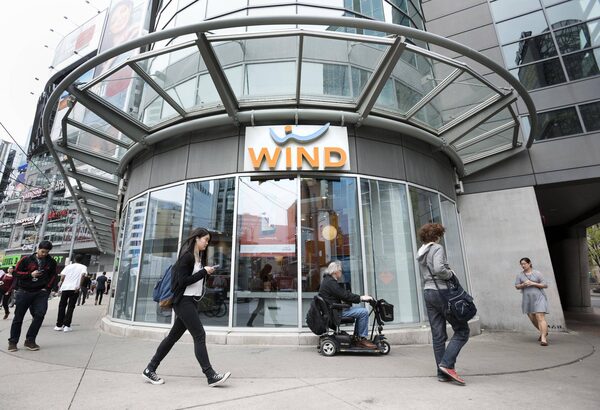 Pedestrians use their mobile phones in front of a Wind Mobile location in Toronto on Tuesday, May 5, 2015.