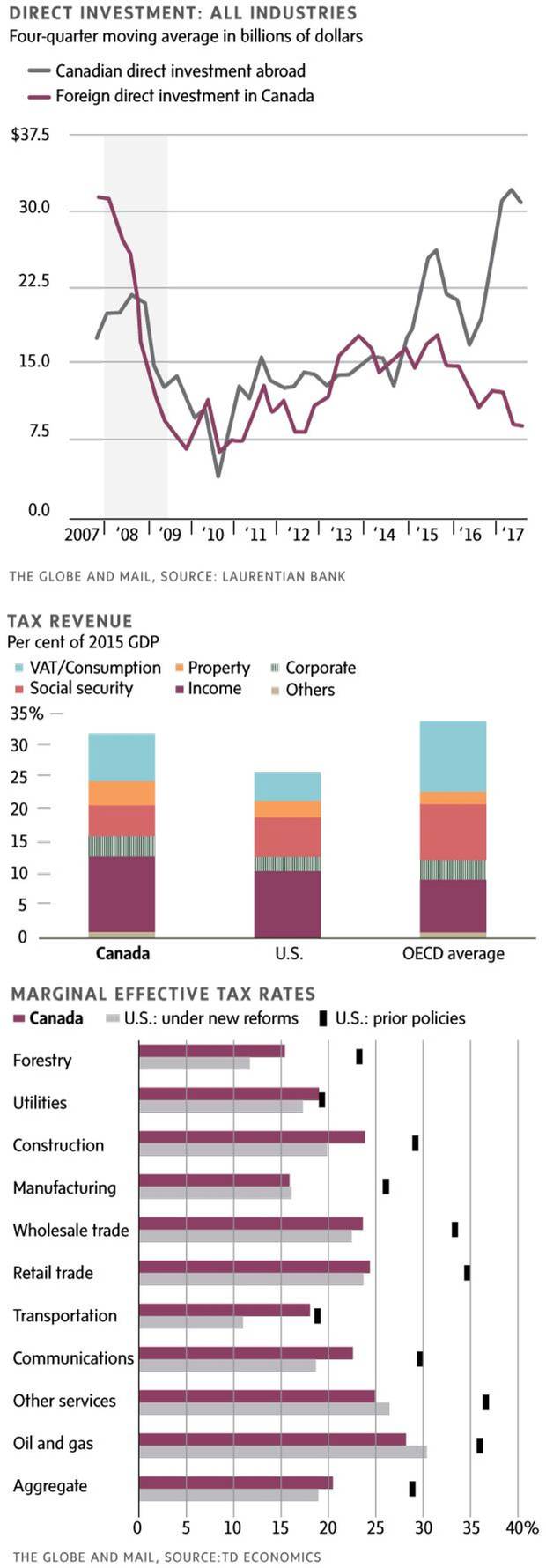 "I don't think you can point at a specific policy of government; I think the business community reacts to an overall tone," Mr. Cross says. "We have had good corporate tax rates in this country, more than competitive with the U.S. up until this year, and yet investment remained weak. Because there was a whole other range of things that governments were doing that the business community doesn't like."