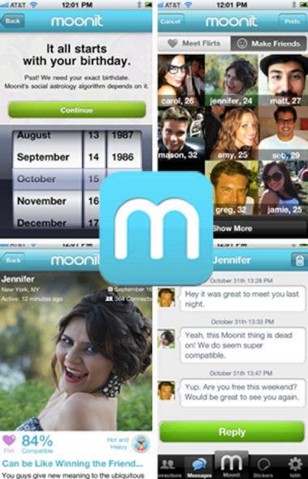 MOONIT: Social discovery app that lets users flirt and find friendship based on astrological signs Founders: Dana Kanze and Mason Sexton launched the alpha version in 2009 at Techcrunch and then launched a full version in 2010 How it works: User creates a profile, checks out other users, requests to connect, accepts, receives compatibility chart Number of users: 1.3 million Target demographic: Ages 13 to 24 looking to connect with people outside of their social network $$$: Rolling out premium subscriptions, including $1.99 feature spots Success rate: 70 per cent relationship compatibility based on birthday algorithm Why it's unique: "There's a huge market opportunity and we aren't able to satisfy it quickly enough... resource constraints are the biggest challenge," says Ms. Kanze Website: http://moonit.com/