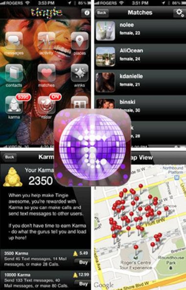 TINGLE: Location-based app that allows you to flirt via text and make phone calls to another user while protecting real-world contact info Founder: Ian Bell launched the company in 2010 How it works: Uses a background process to track location and passes matches through a filter. If there's a match, users will be sent push notifications. "We get that spontaneity without specifically telling people where they are...It also allows women to send messages back and forth without having to reveal their number," says Mr. Bell No. of people on the network: Tens of thousands $$$: Selling Karma, which are credits in Tingle's economic system that act as rewards and protect against spammers, fake profile creators and over-users Website: https://www.tingle.com/
