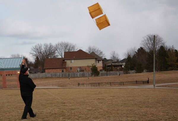 Another piece of the collection soars: George Paisiovich flies a Second World War "Gibson Girl" box kite. Mr. Paisiovich explains that downed pilots would fly this kite with an antenna attached to it so they could send a better SOS signal on their "Gibson Girl" radio transmitter.Ashley Paisiovich