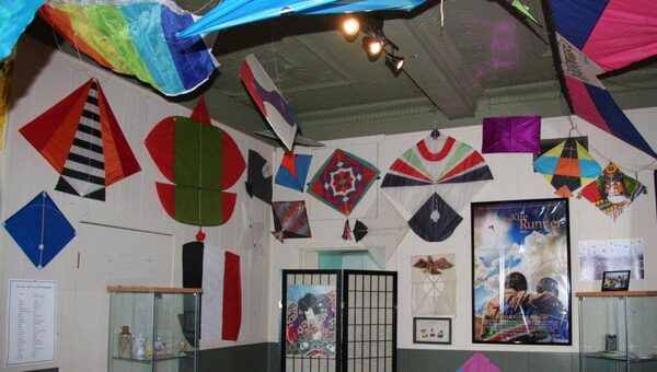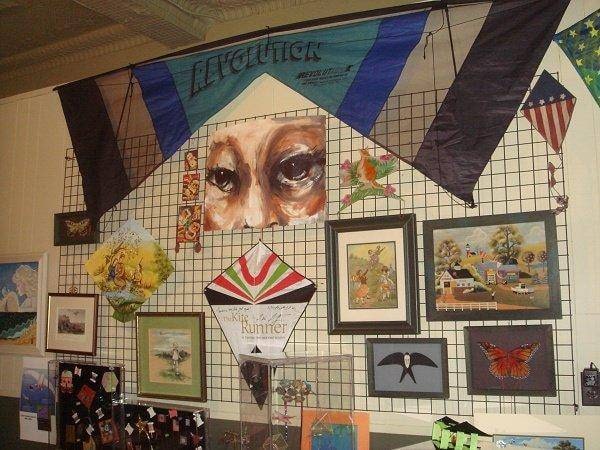One of many kite exhibits organized by collector George Paisiovich shows some of his kites.