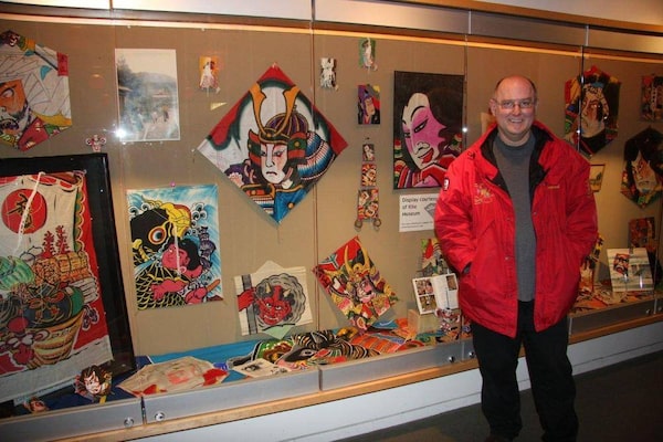 Kite collector George Paisiovich stands in front of a display of some of his Japanese kites. They are part of a collection of more than 100 kites from Japan that are all hand-painted.BOB WHITE