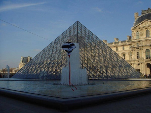 Kite collector George Paisiovich manoeuvres one of his kites in front of the The Louvre Pyramid in the main courtyard of the Louvre Palace in Paris. Mr. Paisiovich controls the kite from outside what you can see in the picture.