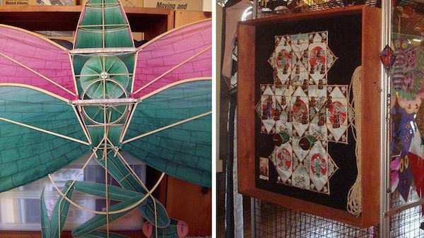 Prized possessions: A “praying mantis” kite, left, made by Chinese kite-master Chen Zhao Ji, and, right, a kite from Nantong, China, featuring 77 whistles that create a racket when fliers loosen the lines of the kite and pull it back in.