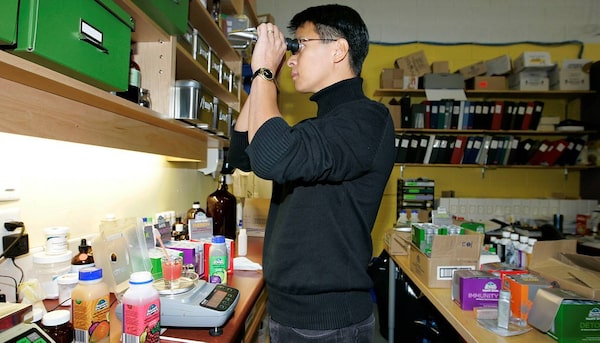 President of Happy Planet Foods Raymond Leung uses a refractometer to test the brix (sugar content) in the juice at the head office in Vancouver, BC.LAURA LEYSHON