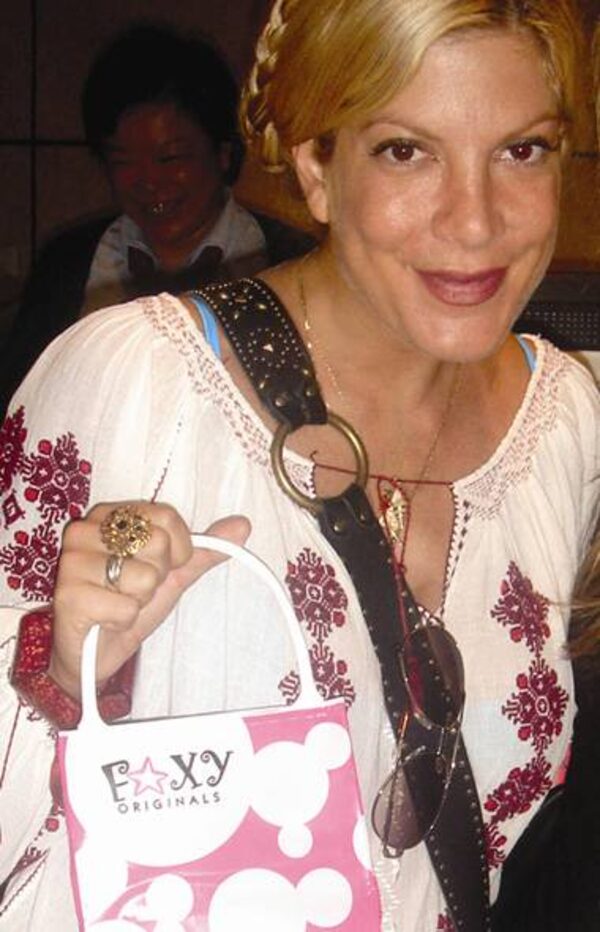 Actress Tori Spelling carries her Foxy Originals earrings in one of its bags.