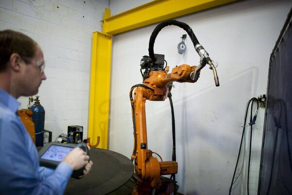 Mr. Williams, who is an electrical engineer by training, demonstrates the use of a robotic welding cell at the Williams and White machine shop. Business is good, he says, but the company can’t decide which of its three parts is the most deserving of monetary investment.Rafal Gerszak/The Globe and Mail