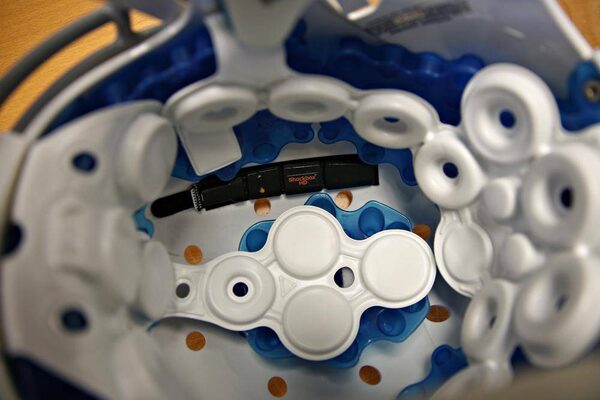 A Shockbox sensor is shown mounted to the inside of a helmet (the black item). The challenge for Impakt Protective is that the makers of sports helmets are warning consumers that adding the sensor may void the helmet’s warranty. The sensors, which weigh one ounce, have been tested, including in concussion research by the University of Pittsburgh Medical Center. Mr. Crossman maintains adding the sensor has no effect on the performance of the helmet.Blair Gable/The Globe and Mail
