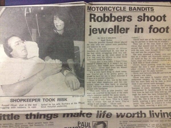 Mr. Oliver was shot in the foot by robbers in April of 1984 – above is a newspaper clipping provided by the family. More, from The Globe and Mail files: A Toronto jewelry store owner who was shot in the right foot when he tried to stop two robbers won't do it again. "I wouldn't leave them alone, so they shot me. I know it was the wrong thing to do. I'm usually a level-headed person," Russell Oliver, 36, said last night from his bed in Mount Sinai Hospital. Mr. Oliver was shot when two men wearing black motorcycle helmets with dark visors held up Oliver Jewellers on Cumberland Avenue about 11:30 a.m. Saturday. They escaped on a red motorcycle. Mr. Oliver said he couldn't believe that "these young kids would have the nerve to walk in at our busiest time on a Saturday morning and try to kill me for jewels they couldn't get any more than $2,000 for."The Globe and Mail