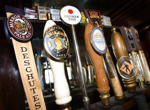 Beer tap handles show a variety of names at the Horsebrass Pub in Portland, Ore., Thursday, July, 2008.Don Ryan/The Associated Press
