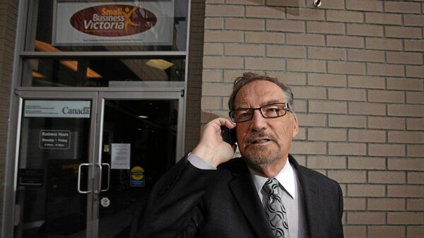 Business Victoria CEO Ken Stratford talks with a client in front of his office in downtown Victoria.