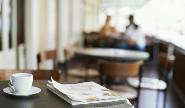 Cup and saucer on a table in a cafeStockbyte
