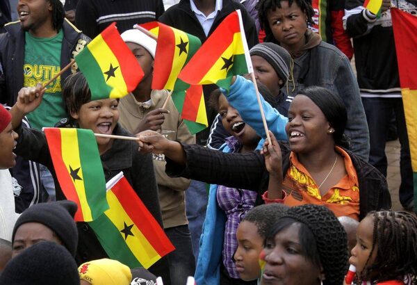 Soccer fans wave Ghana' flags in Yeoville outside Johannesburg, South Africa, Friday July 2, 2010.Jerome Delay/The Associated Press