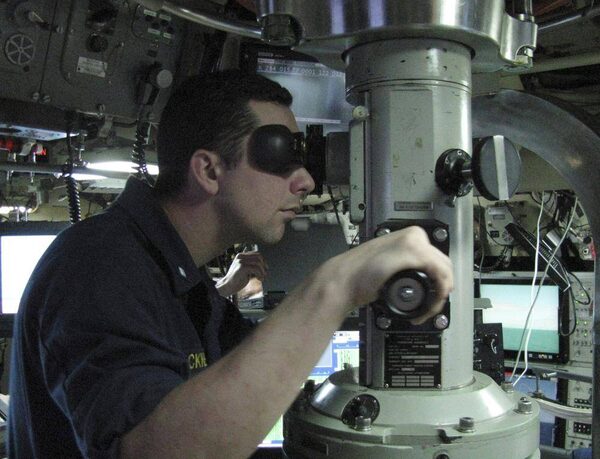 A crew member looks through the periscope aboard the USS Ohio, US Navy's newest billion-dollar submarine, before its maiden voyage off Guam, Sunday, Feb. 3, 2008.Eric Talmadge/The Canadian Press
