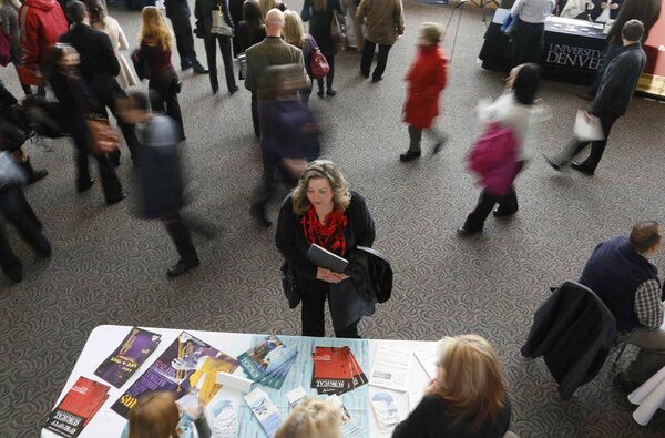 A job seeker (C) talks to an exhibitor at the Colorado Hospital Association health care career fair in Denver in this file photo taken April 9, 2013.RICK WILKING/Reuters