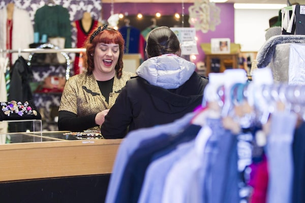 Shannon Leslie Stewart, owner of Covet Community Closet in Stratford, Ont., talks with a customer on Jan. 5, 2018.GEOFF ROBINS/The Globe and Mail