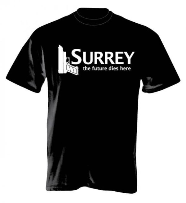 Another shirt displays six bullet holes surrounding the slogan "Better safe than Surrey," a reference to the notorious 2007 Surrey Six slayings of a half dozen people, two of them innocent bystanders, amid gang violence.