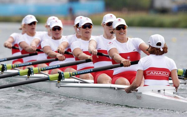 Canada's Lesley Thompson-Willie, Andreanne Morin, Darcy Marquardt, Ashley Brzozowicz, Natalie Mastracci, Lauren Wilkinson, Krista Guloien, Rachelle Viinberg, and Janine Hanson row on their way to winning the silver medal for the women's rowing eight in Eton Dorney, near Windsor, England, at the 2012 Summer Olympics, Thursday, Aug. 2, 2012. Their shell was made by London, Ont.-based Hudson Boat Works.Armando Franca/The Associated Press
