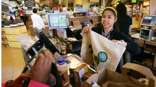 Cashier Michelle Yulo hands out free reusable grocery bags at a Whole Foods Market natural and organic foods stores which is ending the use of disposable plastic grocery bags in its 270 stores in the US, Canada and UK on Earth Day, April 22, 2008 in Pasadena, Calif.David McNew