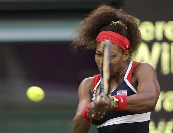 Serena Williams of the U.S. returns to Russia's Vera Zvonareva in their women's singles tennis match at the All England Lawn Tennis Club during the London 2012 Olympic Games on Aug. 1. Ms Williams is among athletes who use Toronto-based firm SpiderTech’s kinesiology tape.SERGIO MORAES