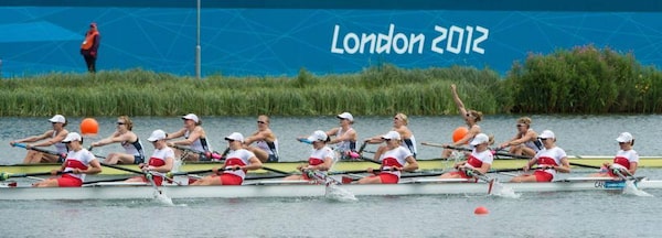 Canada's women's eight rowing team members Janine Hanson, (right to left) Rachelle Viinberg, Krista Guloien, Lauren Wilkinson, Natalie Mastracci, Ashley Brzozowicz, Darcy Marquardt, Andreanne Morin cross the finish line to take silver beside America's gold medal team at Eton Dorney during the 2012 Summer Olympics in Dorney, England on Aug. 2. Their winning shell was supplied by London, Ont.-based Hudson Boat Works.Sean Kilpatrick