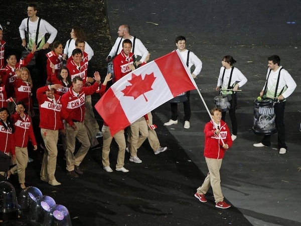 Canada's flag bearer Simon Whitfield holds the national flag as he leads the contingent in the athletes parade during the opening ceremony of the London 2012 Olympic Games at the Olympic Stadium on July 27. Mr. Whitfield is among members of Canada’s Olympic triathlon team to use Stouffville, Ont.-based Saringer Life Science Technologies’ Venowave medical device.DAVID GRAY