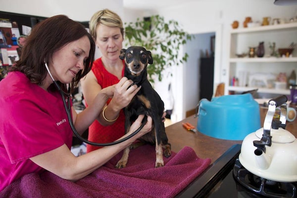 Veterinarian Wendy McClelland, left, checks out a dog while making an animal house call for Sarah Palmer in Calgary on July 3, 2014.Todd Korol/The Globe and Mail