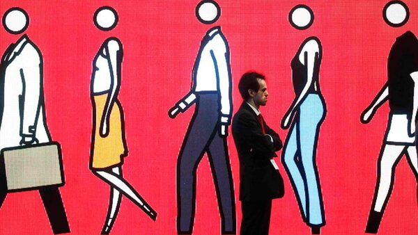 An employee of Santander Bank stands in front its headquarters in Boadilla del Monte, near Madrid April 26, 2010.SUSANA VERA