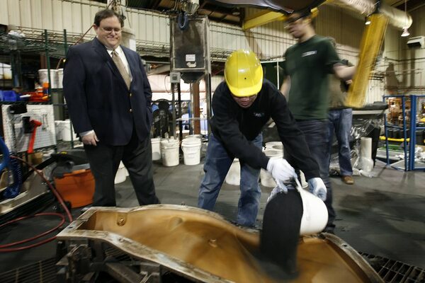 Craig McIntosh, CEO of Winnipeg-based Acrylon Plastics Inc., watches as workers make a rotation moulded plastic drivetrain coverJOHN WOODS